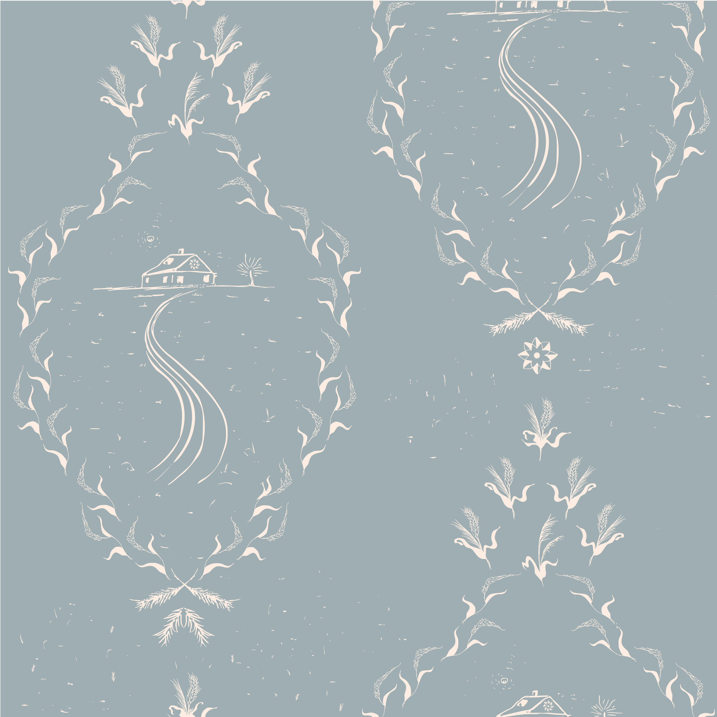 Heirloom Prairie is a love letter to pastoral heritage and the quiet flow of prairie life. A winding driveway leads to a place of simplicity, warmth and belonging. Surrounding grasses and wheat stalks bend in the breeze, delicate and whimsical. Heirloom Prairie inspires a sense of wide open skies, homestead, comfort, and time slowing down – a gentle reminder of the stories that tie us to the land. All motifs are hand-drawn originals.
